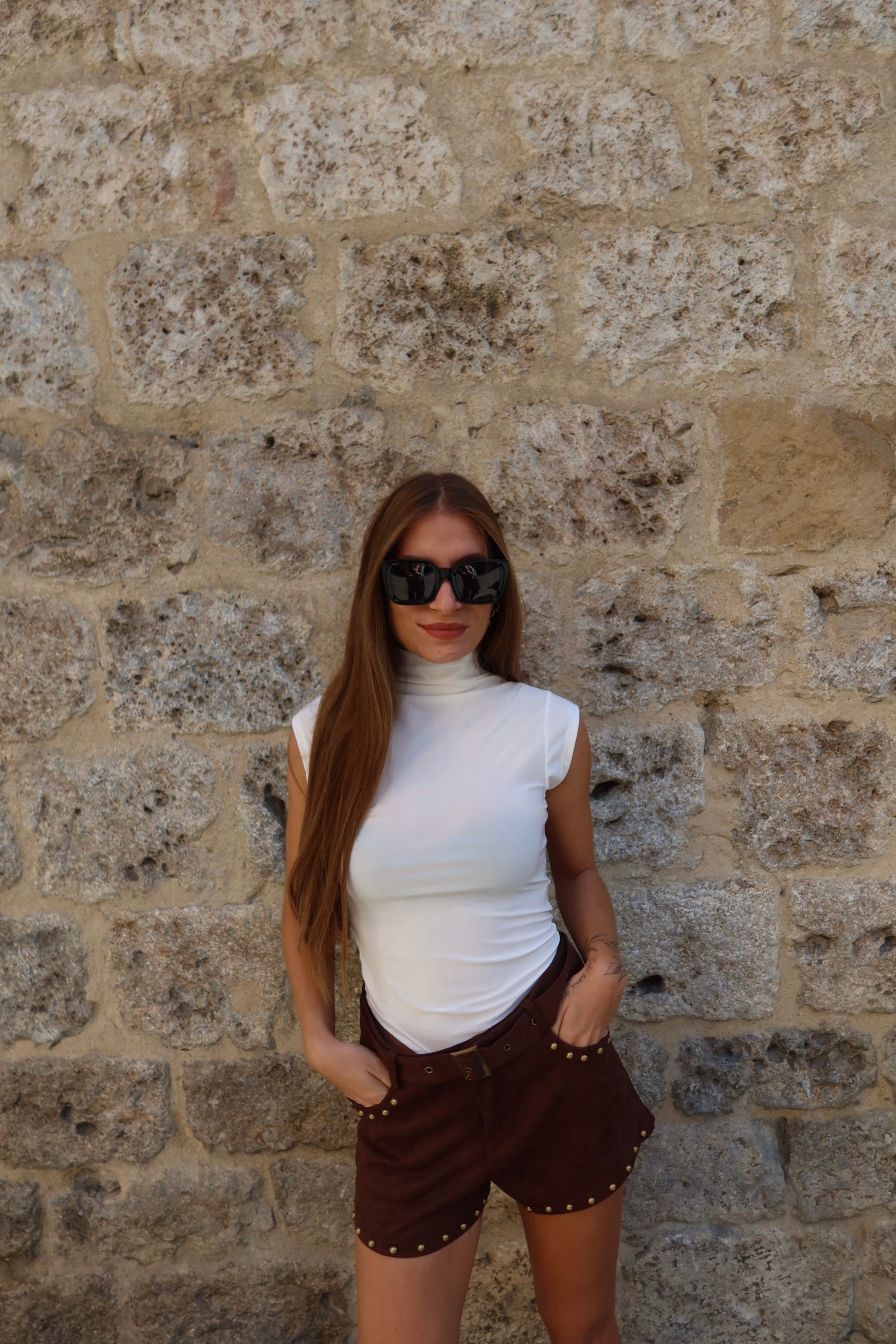 Body a collo alto, taglia unica, veste da XS ad L. Tessuto elasticizzato che si adatta al corpo e valorizza la linea. Disponibile bianco e marrone