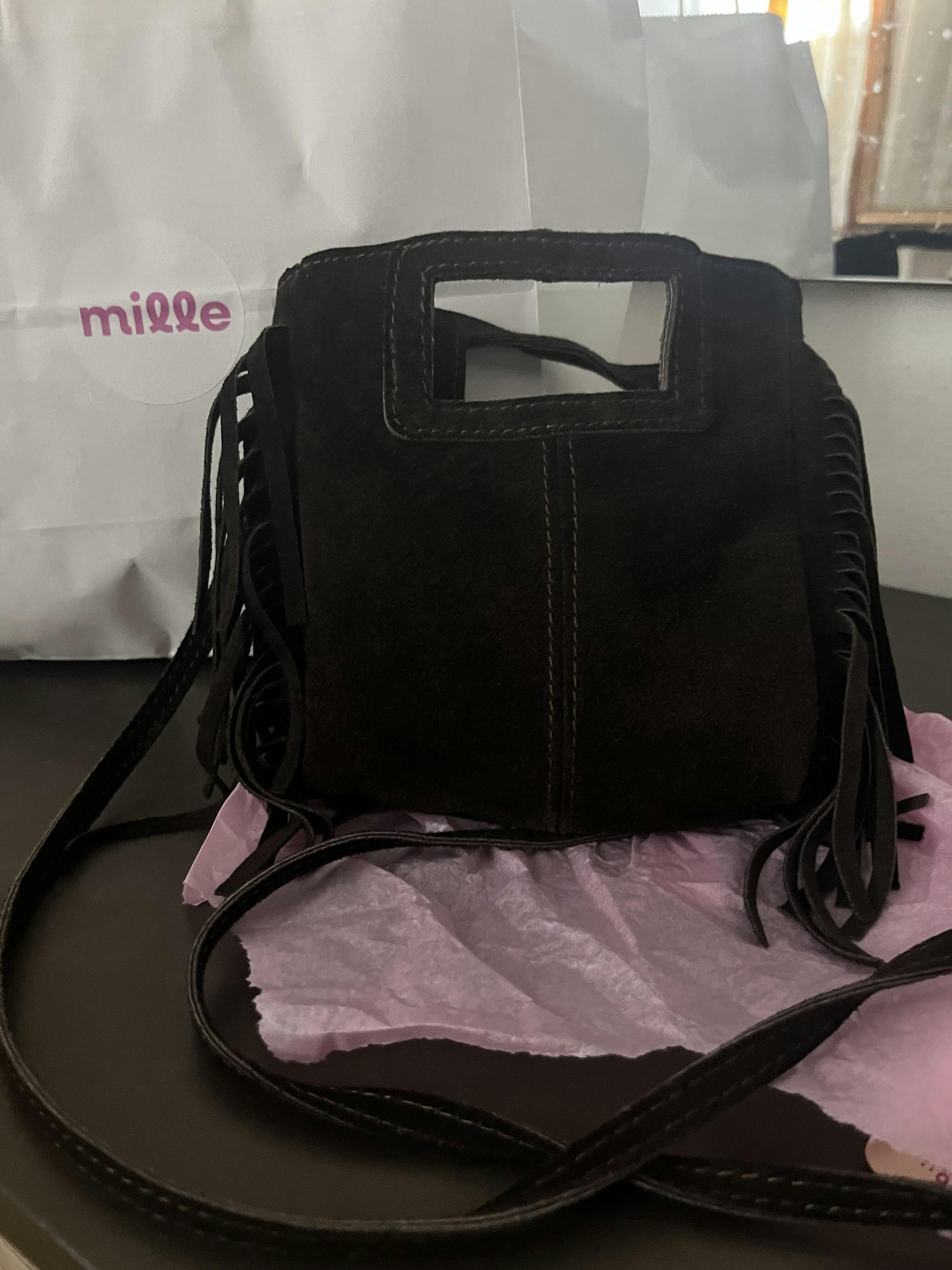 Borsa in vera pelle MADE IN ITALY in morbido suede marrone con frange laterali e manico rigido intagliato. Si può anche aggiungere la tracolla regolabile.