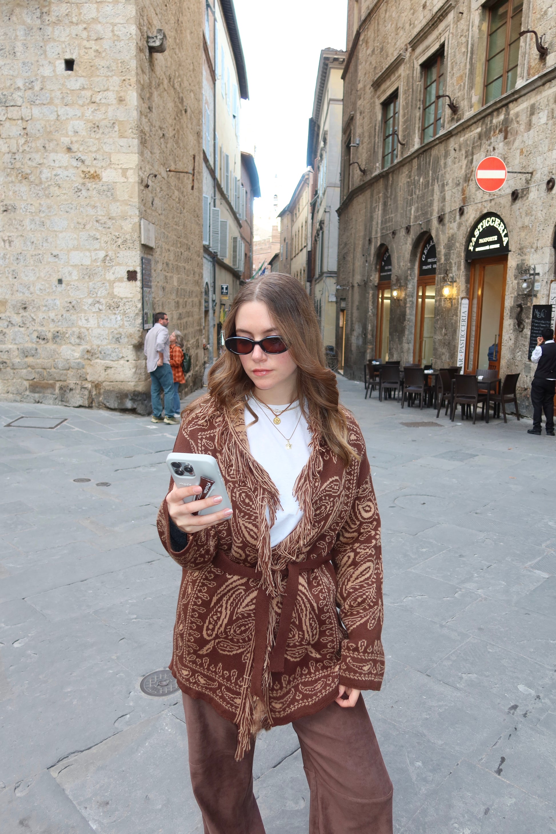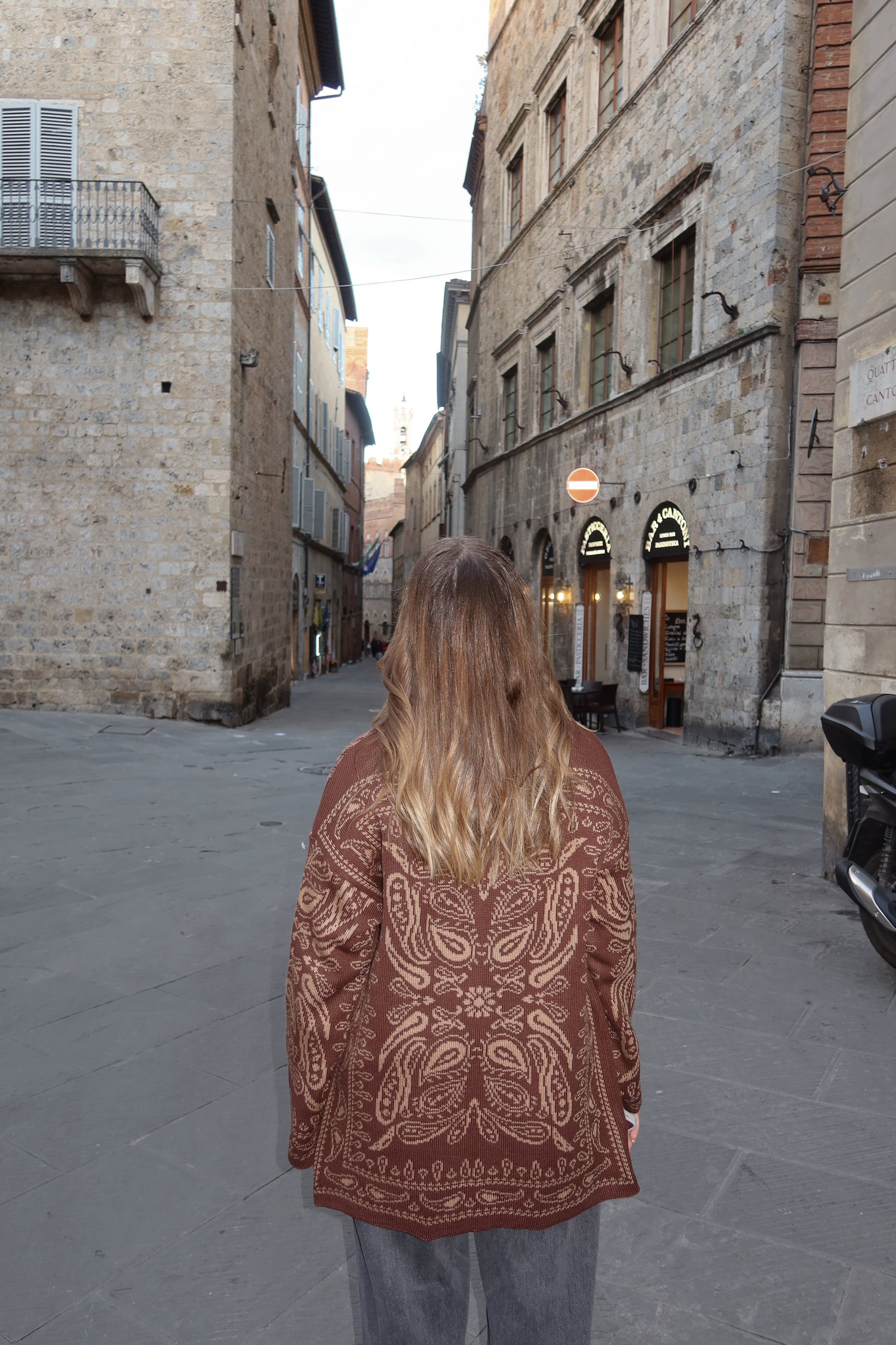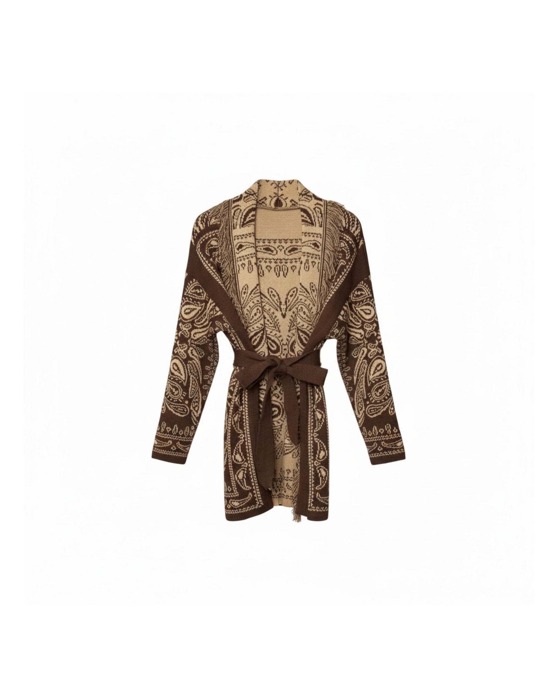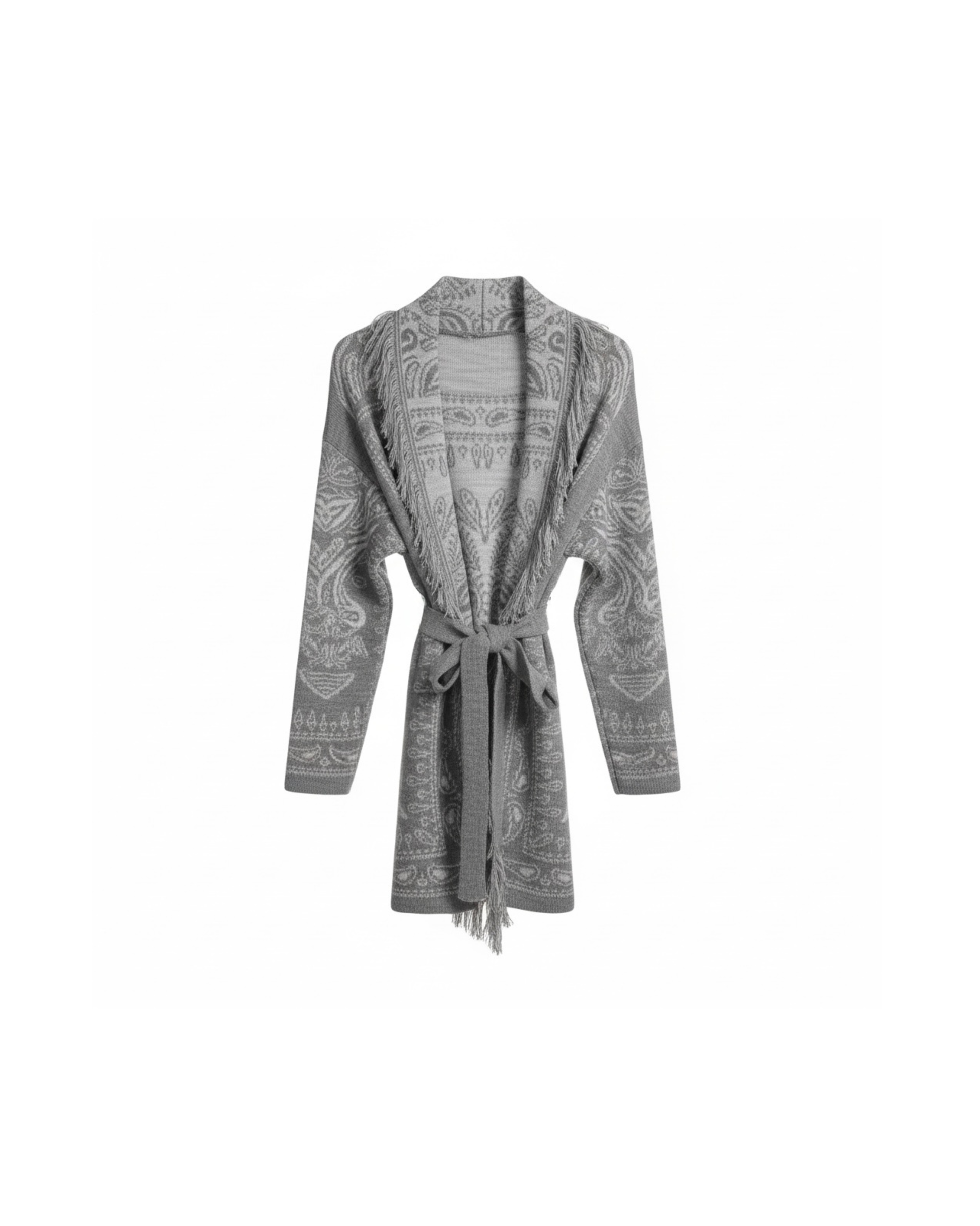Cardigan che si può indossare anche come giacca morbido e avvolgente, caratterizzato da un elegante motivo jacquard. La cintura può essere indossata liberamente, senza passanti, così da permetterti di portarlo sia aperto che chiuso in vita con naturalezza. La vestibilità è comoda e in taglia unica, pensata per adattarsi facilmente a diverse silhouette. Made in Italy.