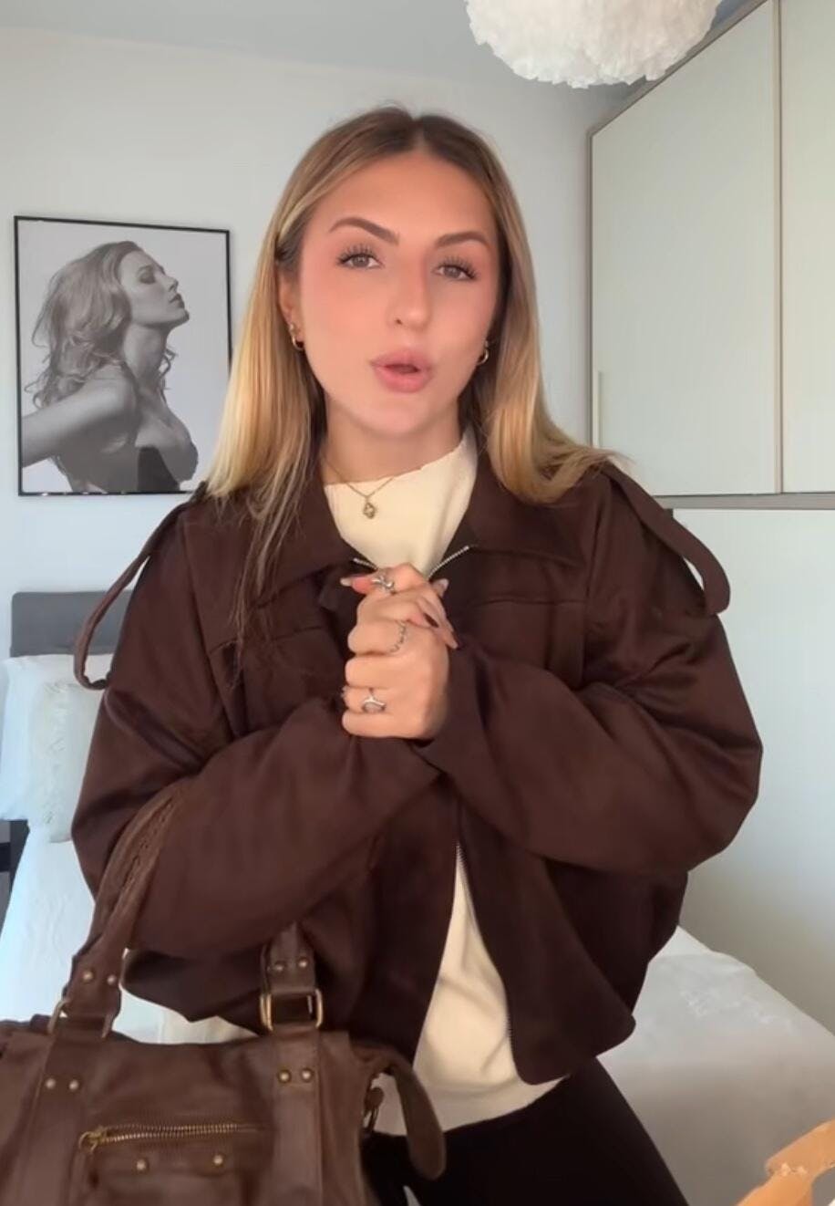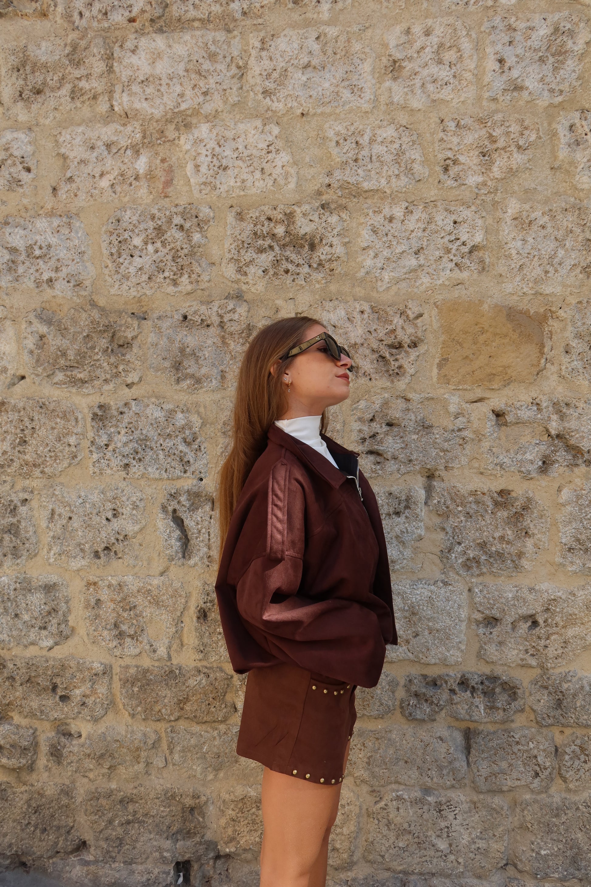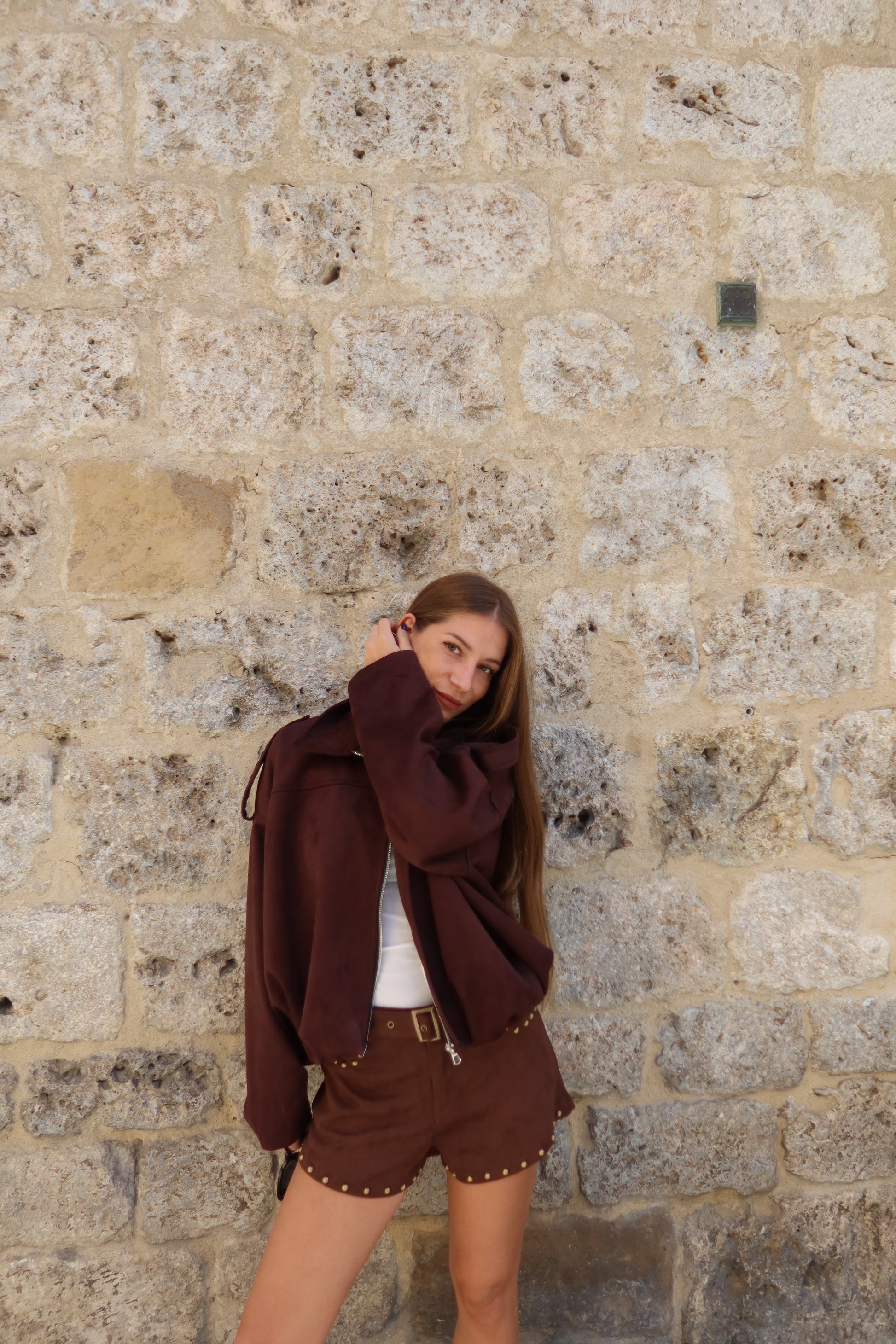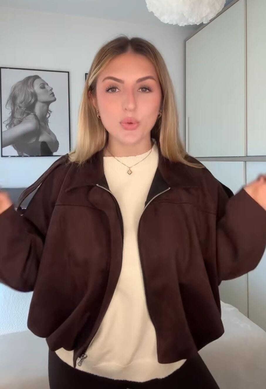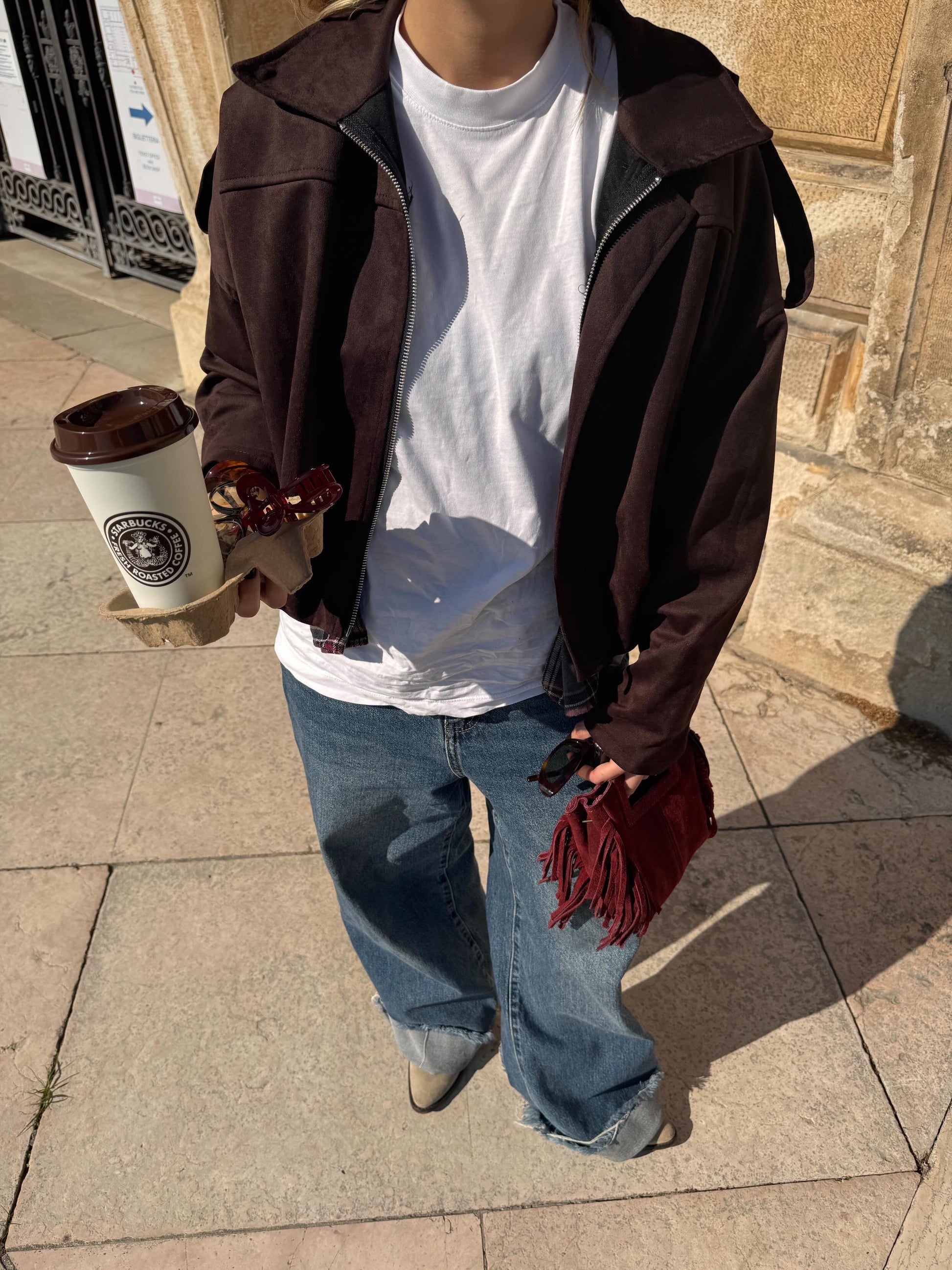 mi sono follemente innamorata della giacca bomber in suede , è caldissima quindi perfetta per l’autunno e l’inverno , con un bel maglione sotto .