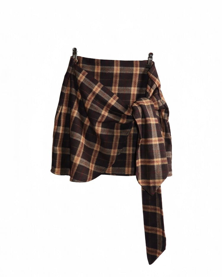 Gonna a quadri in tonalità calde di marrone e beige, con dettaglio di nodo frontale che valorizza la silhouette.