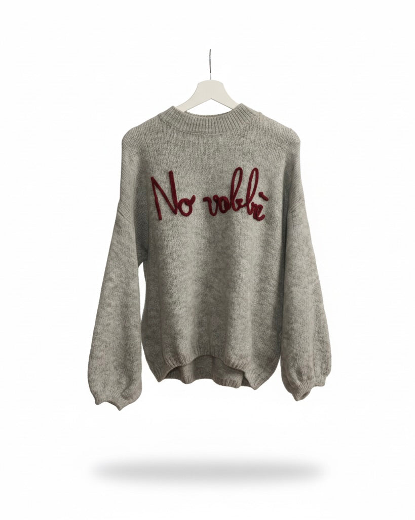 Maglione grigio con ricamo bordeaux “No vabbè” sul retro, dal design morbido e avvolgente.
