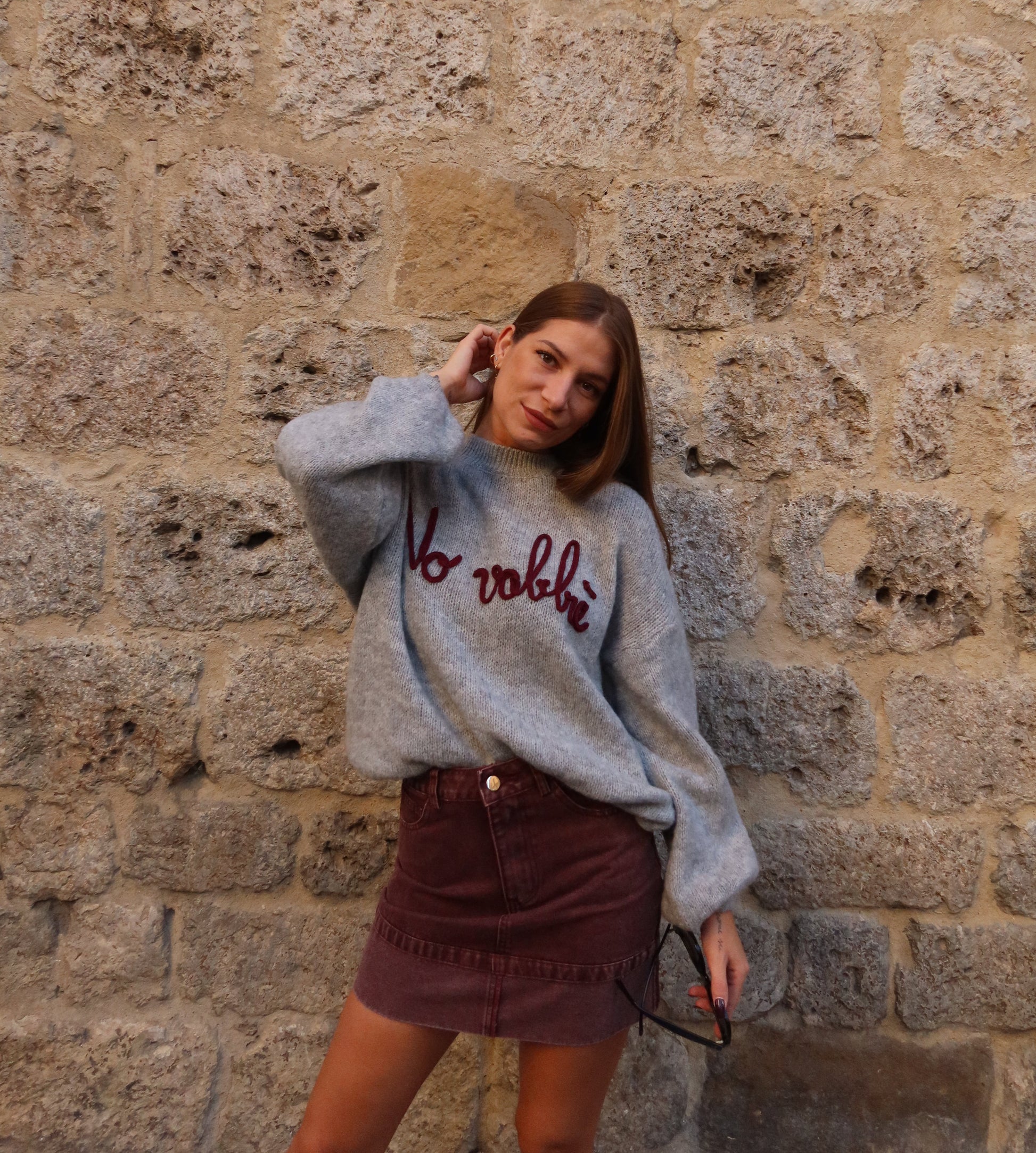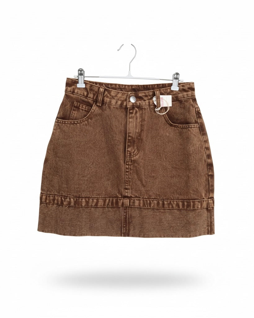 Gonna di jeans in marrone e in una tonalità unica che unisce il rosa antico con le sfumature intense del bordeaux. Disponibile nelle taglie S/M ed M/L, con una vestibilità leggermente più piccola.